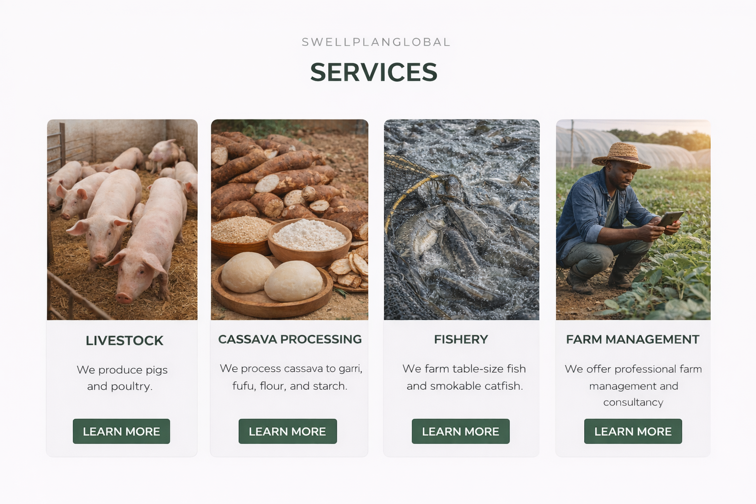 SwellPlan Global Ltd is a fully registered agribusiness company dedicated to large-scale, integrated agricultural production and value addition across livestock, crop farming, aquaculture, agro-processing, and farm management services.